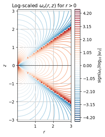 import numpy as npimport matplotlib.pyplot as pltimport matplotlib.colors as colorsalpha =1.0# Grid for r > 0 regionr = np.linspace(0.02, 3, 100)z = np.linspace(-3, 3, 80)R, Z = np.meshgrid(r, z)# Define vorticity component ω_zs = R**2+Z**2omega_z = alpha *(-R**2+2*Z**2) /s**(2.5)# Compute log10 of magnitude and preserve signlog_omega = np.sign(omega_z) * np.log10(np.abs(omega_z) +1e-10)# --- Plot log-scaled ω_z ---plt.figure(figsize=(3, 5))cont = plt.contour(R, Z, log_omega, levels=60, cmap="RdBu_r")plt.colorbar(cont, label=r"$\mathrm{sign}(\omega_z)\log_{10}|\omega_z|$")plt.title(r"Log-scaled $\omega_z(r,z)$ for $r > 0$")plt.xlabel("$r$")plt.ylabel("$z$")plt.axhline(0, color='k', lw=0.8)plt.grid(True)plt.axis("equal")plt.show()