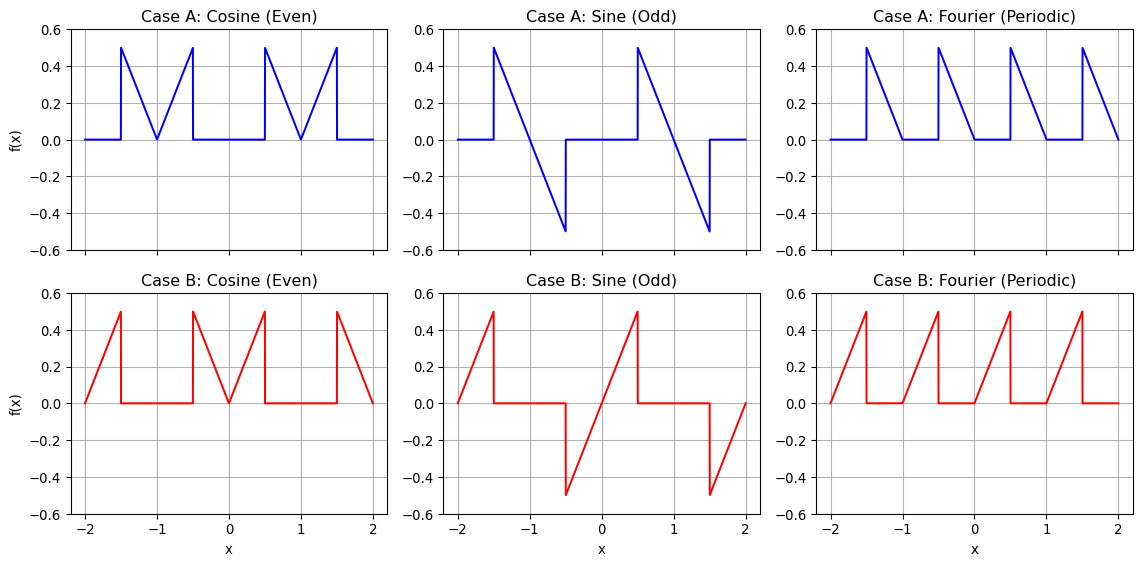 import numpy as npimport matplotlib.pyplot as plt# Define function f(x) on [0, L]L =2* np.pi # for easy visualization, let L = 2πx = np.linspace(-2*L, 2*L, 2000)# Define the base function f(x) on [0, L]def f_base(x): x_mod = x % Lreturn np.where( x_mod < L/2,0,-np.sin(2* np.pi * x_mod / L) )# Even extension (cosine series)def f_even(x):# Reflect across x = 0 and repeat with period 2L x_mod = np.mod(x, 2*L) reflected = np.where(x_mod < L, x_mod, 2*L - x_mod)return f_base(reflected)# Odd extension (sine series) def f_odd(x):# Reflect and invert across x = 0, repeat with period 2L x_mod = np.mod(x, 2*L) reflected = np.where(x_mod < L, x_mod, 2*L - x_mod) sign = np.where(x_mod < L, 1, -1)return sign * f_base(reflected)# Full periodic extension (Fourier series)def f_periodic(x):return f_base(x)# Redefine x-axis from -L to 2Lx_zoom = np.linspace(-L, 2*L, 1000)xticks = [-L, -L/2, 0, L/2, L, 3*L/2, 2*L]xtick_labels = [r"$-L$", r"$-\frac{L}{2}$", r"$0$", r"$\frac{L}{2}$", r"$L$", r"$\frac{3L}{2}$", r"$2L$"]# Plotting with labeled ticksfig, axs = plt.subplots(3, 1, figsize=(6, 8), sharex=True)axs[0].plot(x_zoom, f_even(x_zoom), color='blue')axs[0].set_title('Even Extension (Cosine Series)')axs[0].grid(True)axs[0].set_xlim([-L, 2*L])axs[0].set_ylim([-1.1, 1.1])axs[1].plot(x_zoom, f_odd(x_zoom), color='green')axs[1].set_title('Odd Extension (Sine Series)')axs[1].grid(True)axs[1].set_xlim([-L, 2*L])axs[1].set_ylim([-1.1, 1.1])axs[2].plot(x_zoom, f_periodic(x_zoom), color='red')axs[2].set_title('Periodic Extension (Full Fourier Series)')axs[2].grid(True)axs[2].set_xlim([-L, 2*L])axs[2].set_ylim([-1.1, 1.1])# Set common x-axis ticks and labelsaxs[2].set_xticks(xticks)axs[2].set_xticklabels(xtick_labels, fontsize=12)plt.xlabel('x')plt.tight_layout()plt.show()
